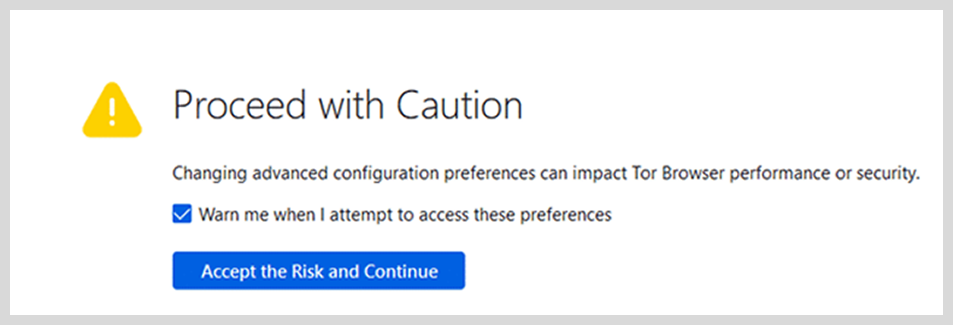 - Πρώτα, πρέπειανοιχτότο πρόγραμμα περιήγησης Tor και εισαγωγήabout:configστη γραμμή διευθύνσεων καιτύποςΕισάγω.