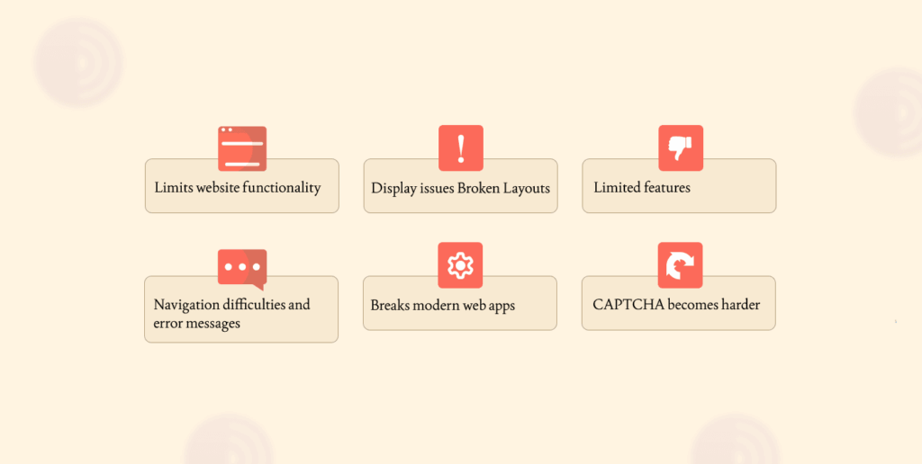 Λένε ότι οτιδήποτε έρχεται με οφέλη πρέπει να έχει και τα μειονεκτήματά του. Η απενεργοποίηση της JavaScript έχει ορισμένα μειονεκτήματα. Μερικά από αυτά περιλαμβάνουν τα ακόλουθα: