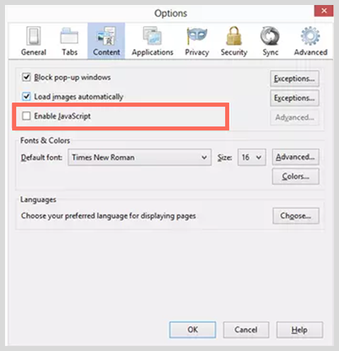 - Προχωρήστε στο "Περιεχόμενο" ενότητα και αποεπιλέξτε την ενότητα "Ενεργοποίηση JavaScript.»