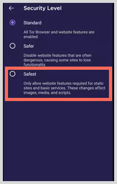 Σημείωση: Αυτή είναι μια καθολική ρύθμιση στο Onion Browser. Σε αντίθεση με το πρόγραμμα περιήγησης Tor για επιτραπέζιους υπολογιστές, δεν μπορείτε να ορίσετε εξαιρέσεις ανά τοποθεσία ή να επιλέξετε διαφορετικά επίπεδα ασφάλειας. Είναι όλα ή τίποτα.