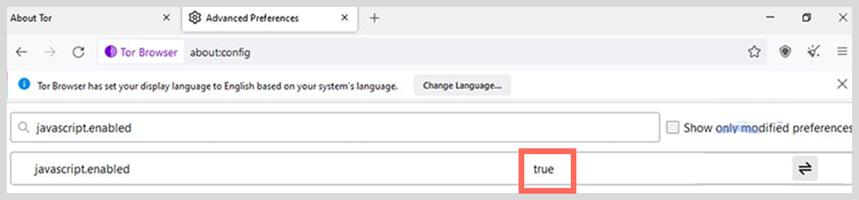 Δείτε πώς μπορείτε να απενεργοποιήσετε το JS (JavaScript) στο πρόγραμμα περιήγησης Tor χρησιμοποιώντας σύνθετες ρυθμίσεις: