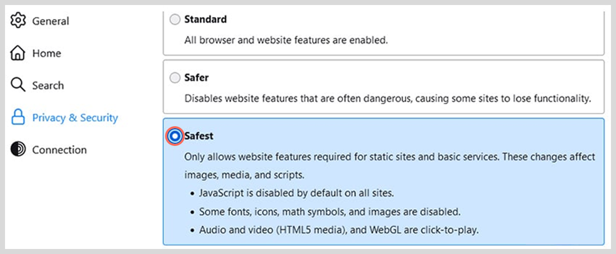 Το πρόγραμμα περιήγησης Tor έχει JavaScriptενεργοποιημένο από προεπιλογή στο «Τυπικό» επίπεδο ασφαλείαςγια να διασφαλιστεί η ευρεία συμβατότητα του ιστότοπου. Ωστόσο, για να εξισορροπηθεί η ασφάλεια και η χρηστικότητα, το Tor Project παρέχει δύο υψηλότερα επίπεδα ασφάλειας που απενεργοποιούν αυτόματα τη JavaScript και άλλες δυνητικά επικίνδυνες λειτουργίες.