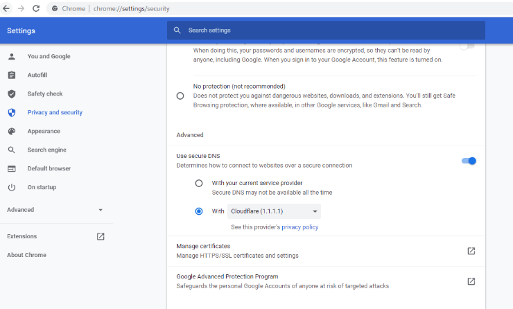 Ρυθμίσεις (τρεις κάθετες κουκκίδες πάνω δεξιά στο πρόγραμμα περιήγησής σας) >Ρυθμίσεις>Απόρρητο και ασφάλεια>Ασφάλεια>Χρησιμοποιήστε το Secure DNS(κάντε κύλιση προς τα κάτω για να δείτε αυτήν την επιλογή στο 'Προχωρημένος' ενότητα) > Έλεγχος 'Μεκαι επιλέξτε την υπηρεσία DNS που επιθυμείτε.