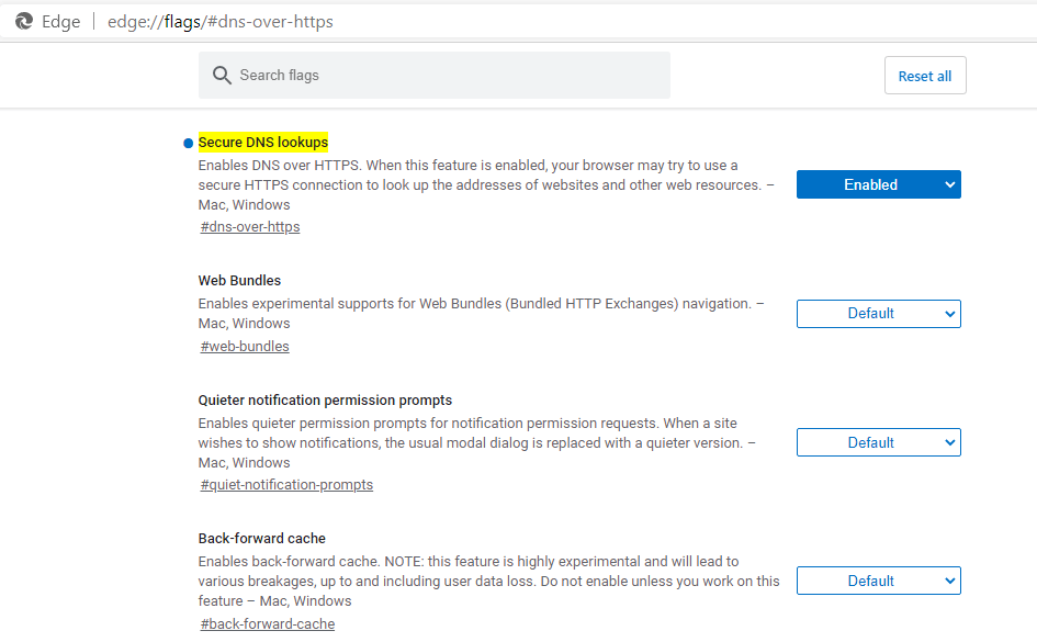 Επομένως, πρέπει να επισκεφτείτε τις σημαίες του προγράμματος περιήγησης για να ενεργοποιήσετε το ασφαλές DNS. Απλά πληκτρολογήστε "edge://flags/#dns-over-https"και πατήστε "Εισάγω.' Στη συνέχεια θα δείτε την παρακάτω οθόνη. διαλεξε'Καθιστώ ικανό' από το αναπτυσσόμενο μενού.