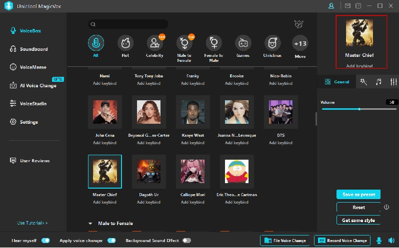 Το Unictool MagicVox είναι αδιαμφισβήτητα το καλύτεροMaster Chief Ai Voice Changer. Είτε θέλετε να χρησιμοποιήσετε τοMaster Chief VoiceΕνώ παίζετε Halo Infinite ή απλά θέλετε να αλλάξετε τη φωνή σας, το MagicVox έχει όλα τα χαρακτηριστικά που θα ζητήσετε.