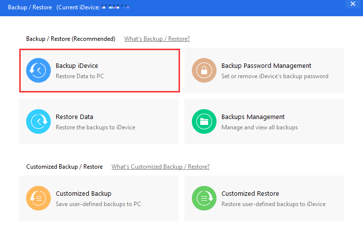 Βήμα 2:Συνδέστε το iPhone σας στον υπολογιστή και ανοίξτε το 3UTOOLS. Μεταβείτε στο IDEVICE> Backup/Restore> Back Up Idevice για να δημιουργήσετε ένα αντίγραφο ασφαλείας των δεδομένων σας.