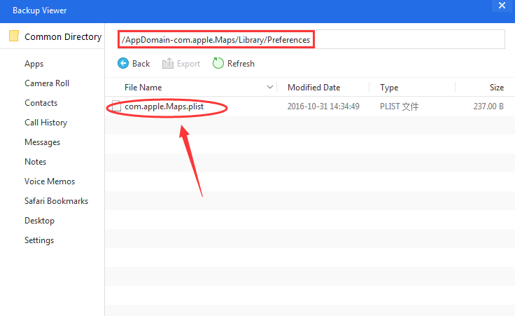 Βήμα 3:Μεταβείτε στο Backup/Restore> Backup Management και εντοπίστε το τελευταίο αντίγραφο ασφαλείας. Μέσα σε αυτό το αντίγραφο ασφαλείας, μεταβείτε στο AppDocument> AppDomain-com.apple.maps> Βιβλιοθήκη> Προτιμήσεις. Βρείτε και κάντε διπλό κλικ στο αρχείο "com.apple.maps.plist" για να το ανοίξετε. Και επεξεργαστείτε το περιεχόμενο όπως φαίνεται στην παρεχόμενη εικόνα.