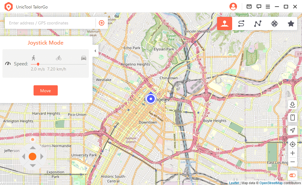- 2Εάν θέλετε να κοροϊδεύετε την τοποθεσία GPS σας με joystick, επιλέξτε τη λειτουργία joystick στην επάνω δεξιά γωνία (το 1ο). Με μόνο ένα κλικ στο"Κίνηση"κουμπί, μπορείτε να μετακινηθείτε αυτόματα στον χάρτη.