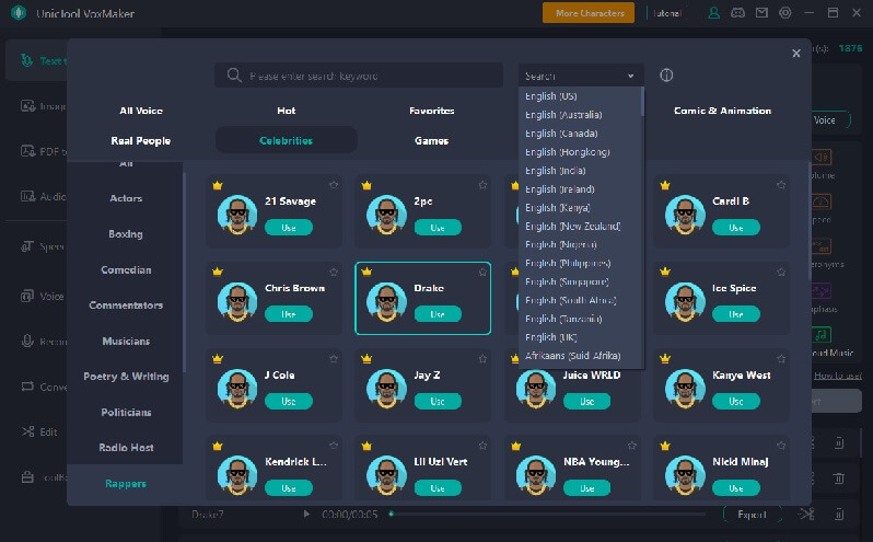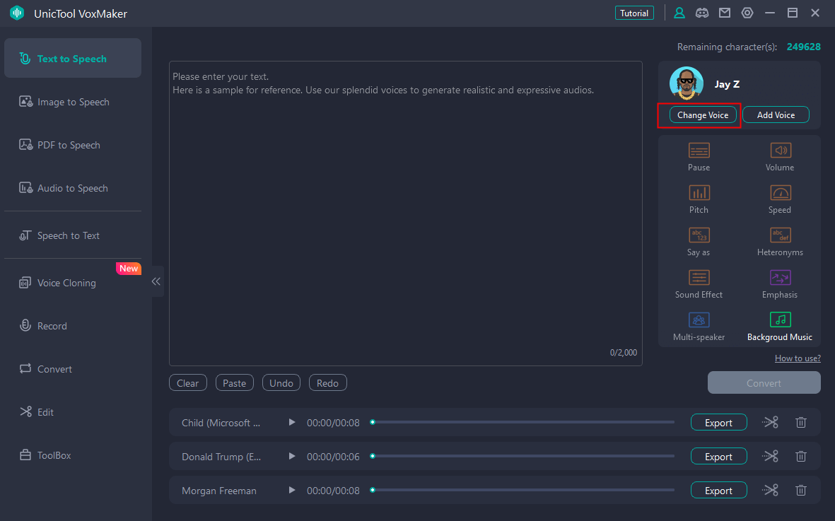 Όλα σε ένα Φωνητική Εργαλειοθήκη: Οι χρήστες μπορούν να απολαμβάνουν λειτουργίες όπωςομιλία σε κείμενο,εικόνα σε λόγο,Κλωνοποίηση φωνής AI,ήχο σε ομιλία, και ως συσκευή εγγραφής φωνής, σας επιτρέπει να ηχογραφείτε, να επεξεργάζεστε και να μετατρέπετε τις φωνητικές σας ηχογραφήσεις.