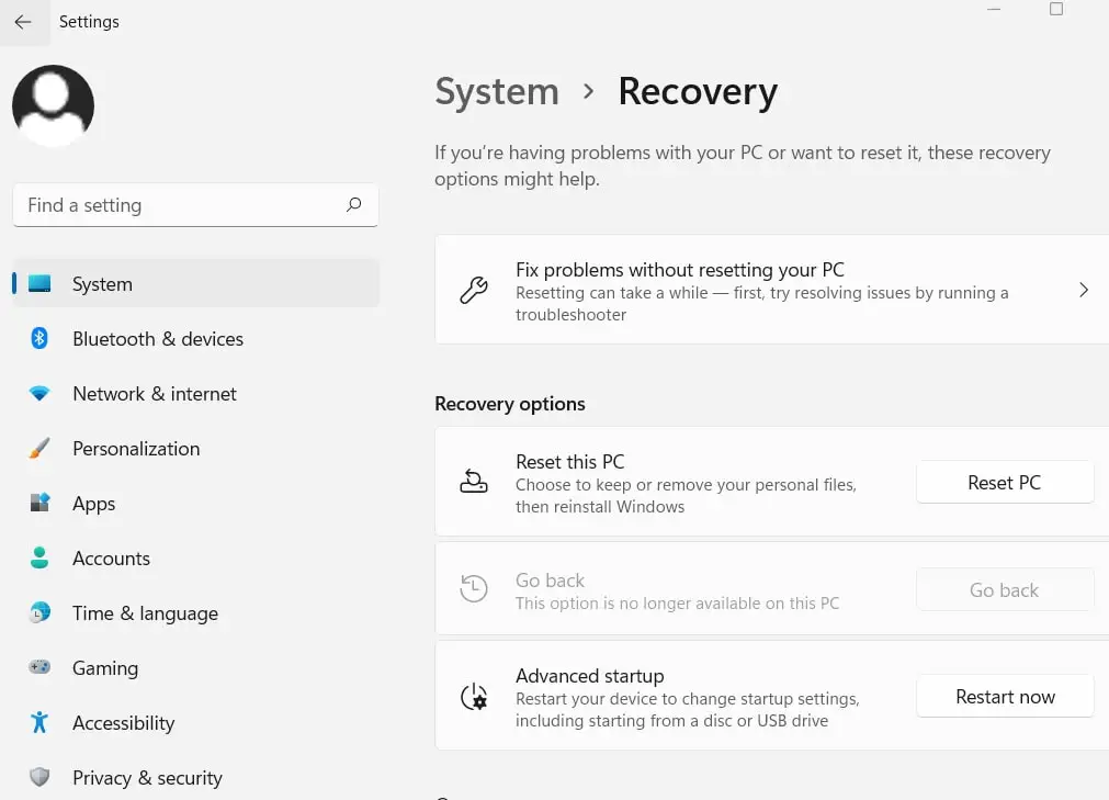 - Κάντε κλικ στο σύστημα και στη συνέχεια μετακινηθείτε προς τα κάτω στα δεξιά και επιλέξτε την επιλογή "Ανάκτηση".
