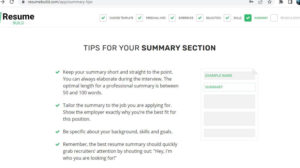 - Τέλος, πρέπει να δημιουργήσετε έναν δωρεάν λογαριασμό με το Resumebuild για να αναθεωρήσετε και να κατεβάσετε το βιογραφικό σας δωρεάν.