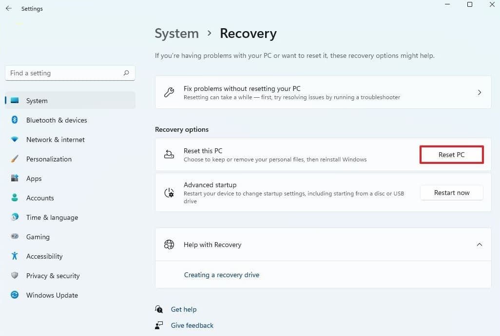 ΟΕπαναφορά αυτής της λειτουργίας PCείναι μια ενσωματωμένη επιλογή στα Windows 11 που σας επιτρέπειΕπανατοποθετήστε τα Windows χωρίς να χάσετε τα προσωπικά σας αρχείακαι ρυθμίσεις. Μπορεί να σας βοηθήσει να διορθώσετε τα αλλοιωμένα αρχεία συστήματος με την αποκατάσταση του υπολογιστή σας στην κατάσταση του εργοστασίου ή σε προηγούμενη κατάσταση εργασίας.
