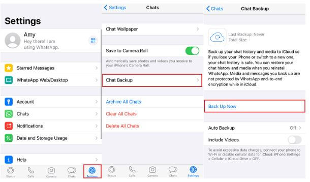 Δεδομένου ότι τα αρχικά περιεχόμενα WhatsApp στο iPhone-στόχο θα άλλαζαν μετά τη μεταφορά, είναι καλύτερο να ξεκινήσετε με τη δημιουργία αντιγράφων ασφαλείας του WhatsApp.