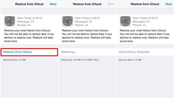 - Βήμα 5. Στη συνέχεια, το iPhone σας θα εμφανίσει την οθόνη "Επαναφορά από το iCloud". Για να ξεκινήσετε την επαναφορά μηνυμάτων και αρχείων WhatsApp στο νέο σας iPhone, επιλέξτε "Επαναφορά ιστορικού συνομιλίας".