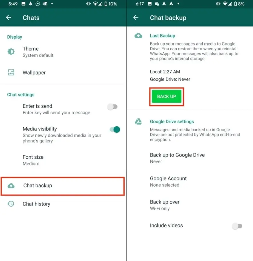 Μπορείτε να χρησιμοποιήσετε την ίδια ενσωματωμένη δυνατότητα δημιουργίας αντιγράφων ασφαλείας του WhatsApp για τη μετεγκατάσταση του WhatsApp από το Android στο Android, όπως ακριβώς μπορείτε με το iPhone. Αντί για το iCloud, θα λάβετε βοήθεια από το Google Drive.