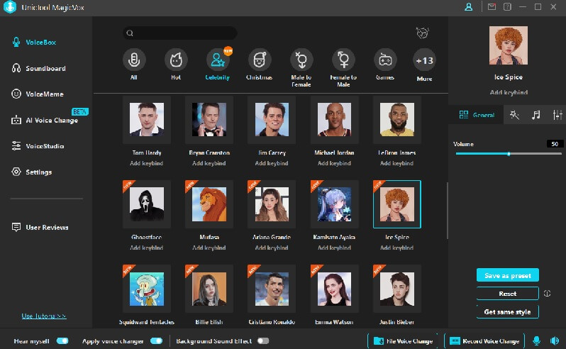 Με πάνω από 400+ ηχητικά εφέ, 150+ φωνητικά μιμίδια και φίλτρα φωνής 125+, το unictool MagicVox Ice Spice AI Voice Changer είναι μια κορυφαία επιλογή για τους χρήστες που θέλουν να αποκτήσουν γρήγορα μια φωνή AI Ice Spice και να διασκεδάζουν φίλους. Είτε για προσωπική ή επιχειρηματική χρήση, τα τελευταία εργαλεία που παρέχονται από το MAGICVOX μπορούν να βοηθήσουν στη δημιουργία μοναδικών ηχητικών εφέ και προσαρμοσμένων γηπέδων.