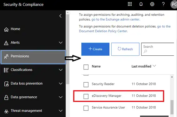 - Κάντε κλικ στοΔικαιώματαΕπιλογή για να το σύρετε στο Ediscovery Manager όπως φαίνεται στην αντίστοιχη οθόνη.