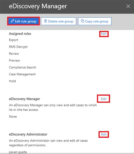 - Ελέγξτε τοδιαχειριστής ediscoveryεπιλογή. Μετά από αυτό, κάντε κλικ στοΕκδίδωΕικονίδιο για την εκχώρηση σημαντικών ρόλων που είναι υποχρεωτικοί για την ομάδα διαχείρισης Discovery.