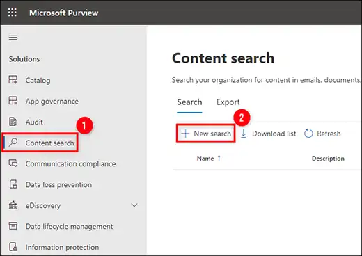 - Στη συνέχεια, χτυπήστεΠερισσότεροΠόροι και Ανοίξτε την Πύλη Συμμόρφωσης της Microsoft Purview. Τώρα επιλέξτεΑναζήτηση περιεχομένου >> Νέα αναζήτησηεπιλογή.