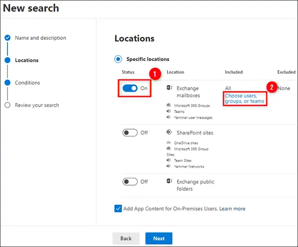 - Αφού κάνετε κλικ στοΝέα αναζήτησηΕπιλογή, θα εμφανιστεί ένας νέος οδηγός. Αυτός ο οδηγός θα σας επιτρέψει να προσαρμόσετε όλα τα στοιχεία των επιλογών αναζήτησης περιεχομένου. Οι χρήστες μπορούν να εισαγάγουν το όνομα και την περιγραφή της αναζήτησης. Η επιλογή τοποθεσίας σας επιτρέπει να καθορίσετε δεδομένα γραμματοκιβωτίου που θέλετε να εξαγάγετε.