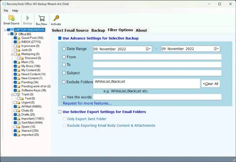 - Μπορείτε να χρησιμοποιήσετε τοΕπιλογές φίλτρουΓια να αναζητήσετε συγκεκριμένα μηνύματα ηλεκτρονικού ταχυδρομείου και να τα εξαγάγετε.