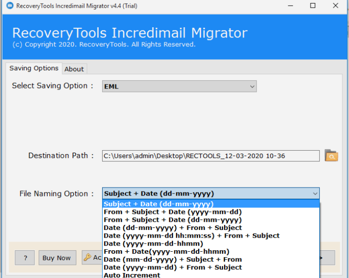 - Το Incredimail IML σε EML Converter προσφέρει αρκετές επιλογές μετατροπής ονομασίας αρχείων για τη διατήρηση των προκύπτουσας αρχείων κατά ημερομηνία, υποκείμενο, από, χρόνο κλπ.