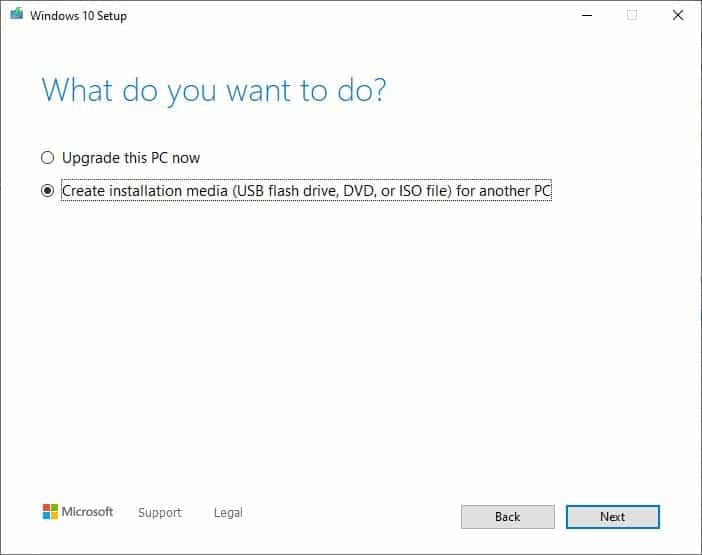 - Στην επόμενη οθόνη Επιλέξτε τοΔημιουργήστε μέσα εγκατάστασης (μονάδα flash USB, DVD ή αρχείο ISO) για άλλον υπολογιστήεπιλογή και κάντε κλικ στο επόμενο.