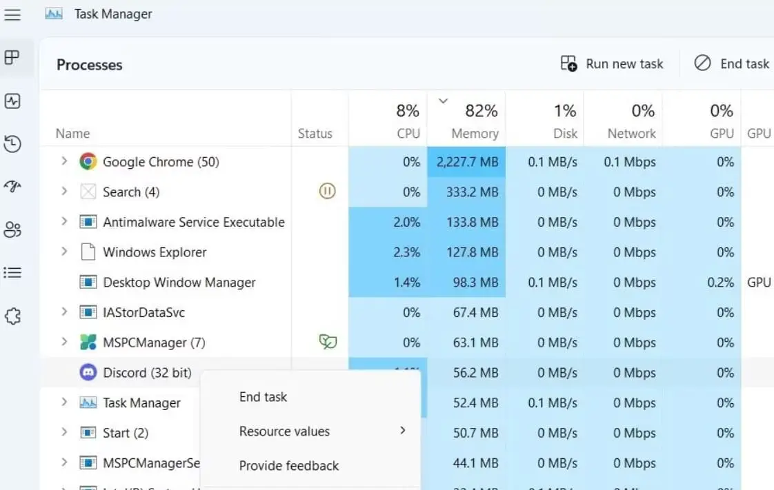 - Βεβαιωθείτε ότι έχετε κλείσει την εφαρμογή Discord ή ανοίξτε το Διευθυντή Εργαστηρίου Κάντε δεξί κλικ στο Discord και, στη συνέχεια, επιλέξτε End Task,