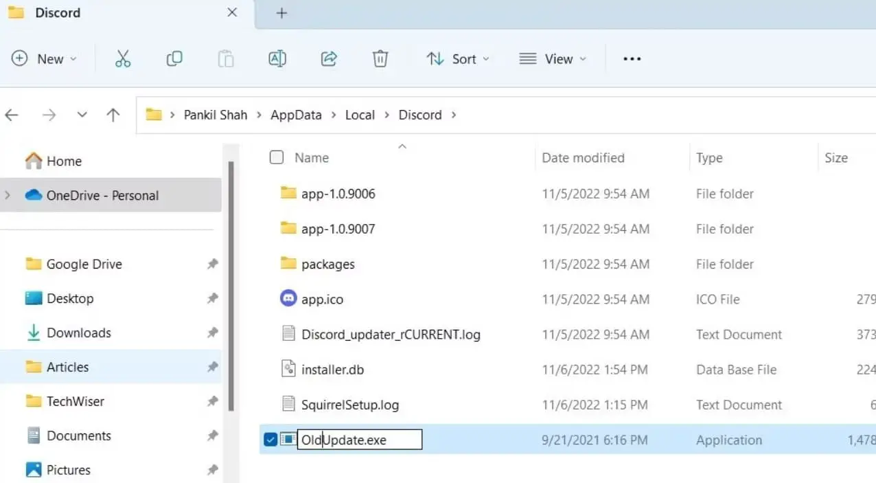 - Μεταβείτε στο φάκελο Discord εντοπίστε το φάκελο update.exe και μετονομάστε το στο oldupdate.exe