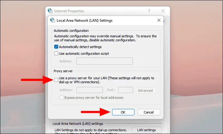 - Καταργήστε την επιλογή Use a proxy server for your LAN και κάντε κλικ στο OK