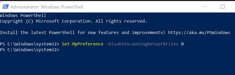 - Εκτελέστε την εντολήSet -mppreference -disablescanningNetWorkFiles 0για να ενεργοποιήσετε τη σάρωση δικτύου.
