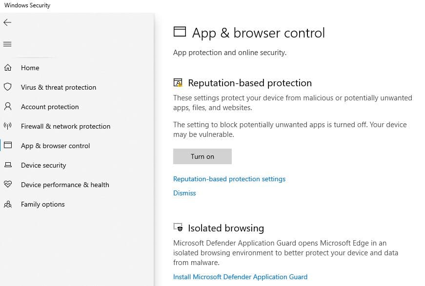 - Πρώτον, ανοίξτε την ασφάλεια των Windows, κάντε κλικ στο App & Control Control και, στη συνέχεια, ενεργοποιήστε το κουμπί προςΕνεργοποιήστε την προστασία που βασίζεται στη φήμη