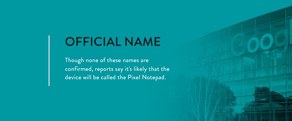 Αν και κανένα από αυτά τα ονόματα δεν επιβεβαιώνονται, αναφέρουν ότι είναιΠιθανότατα ότι η συσκευή θα ονομαστεί pixel notepad. Εάν είναι αλήθεια, το νέο τηλέφωνο πιθανότατα θα προσφέρει υποστήριξη γραφίδας και θα μιμείται πολλά από τα σημερινά δισκία και δυνατότητες και δυνατότητες.