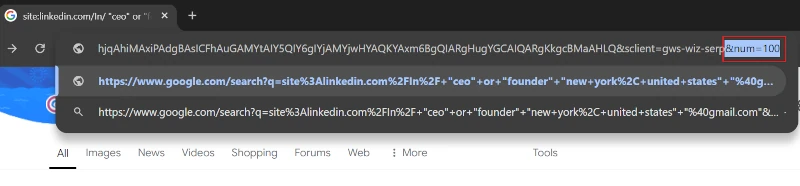 - Τώρα, θα προσθέσουμε"& Num = 100"Στο τέλος της διεύθυνσης URL για να δείτε 100 αποτελέσματα σε μια σελίδα.