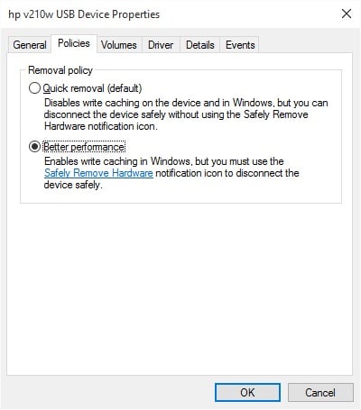 Σημείωση: Μετά την αλλαγή της πολιτικής συσκευής για καλύτερη απόδοση, η ταχύτητα μεταφοράς δεδομένων σας θα αυξηθεί, αλλά βεβαιωθείτε ότι έχετε κάνει πάντα κλικ στο "Καταργήστε με ασφάλεια το υλικό και την εκτόξευση μέσων"Πριν αφαιρέσετε το Pendrive σας.