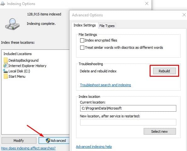 - Στο παράθυρο "Προχωρημένες επιλογές", επιλέξτε την καρτέλα "Ρυθμίσεις ευρετηρίου" και κάντε κλικ στο κουμπί "Ανακατασκευή"