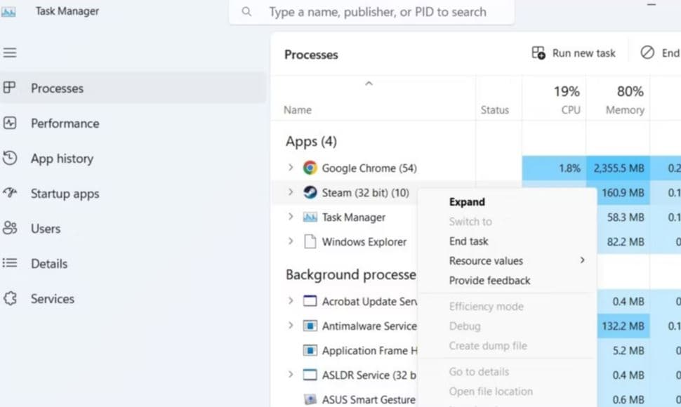 - ΤύποςCtrl + Shift + Escγια να ανοίξετε τη Διαχείριση εργασιών. Στην καρτέλα Διεργασίες, κάντε δεξί κλικ στο Steam και επιλέξτε Τέλος εργασίας από το μενού περιβάλλοντος.