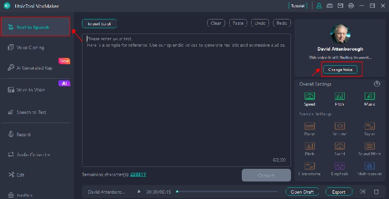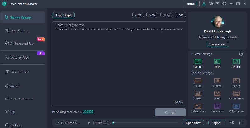 Δοκιμάστε αυτό το online voxmaker David Attenborough AI Voice Text-to-Speech. Ειδικότερα, έχετε3 δωρεάν δοκιμές. Για να αποκτήσετε πρόσβαση σε περισσότερες φωνές διασημοτήτων, κάντε κλικ"Δοκιμάστε περισσότερες φωνές"Παρακάτω για να κατεβάσετε δωρεάν το λογισμικό.