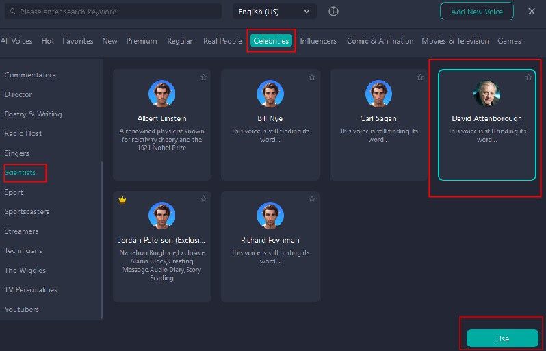 - 2Βρείτε "επιστήμονες" στην κατηγορία "Celebrity" στην κορυφή. Εκτός από τη φωνή του David Attenborough, υπάρχουν επίσης οι φωνές της Ιορδανίας Peterson και άλλων διασημοτήτων. Ή μπορείτε να επιλέξετε να αναζητήσετε το "David Attenborough" απευθείας στο πλαίσιο αναζήτησης στην κορυφή.