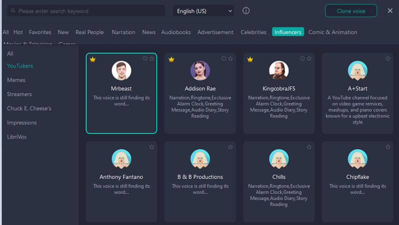 Σε αυτό το άρθρο, παρουσιάσαμε πώς να το κάνετε εύκολαδημιουργήστε μια φωνή CaseOh AIχρησιμοποιώντας μια γεννήτρια φωνής. Αξιοποιώντας το UnicTool VoxMaker, μπορείτε να βελτιώσετε το περιεχόμενό σας με ρεαλιστικές φωνές AI, κάνοντας τα βίντεό σας πιο ελκυστικά και επαγγελματικά. Κατεβάστε και εγκαταστήστε το VoxMaker για να λάβετε μια δωρεάν δοκιμή μετατροπής κειμένου σε ομιλία 2000 χαρακτήρων. Προσφέρει έναν τεράστιο αριθμό μοντέλων φωνής για να διαλέξετε! Δοκιμάστε το σήμερα και ανεβάστε τη δημιουργία περιεχομένου στο επόμενο επίπεδο!