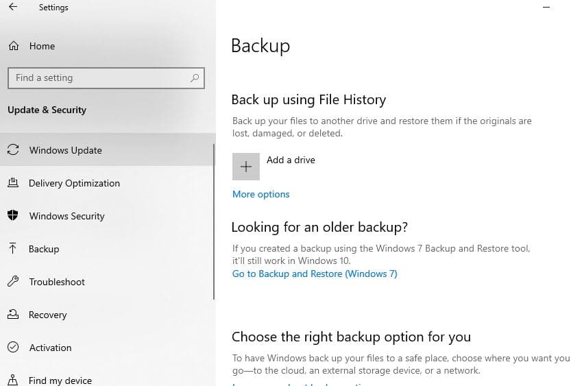 Η Microsoft έχει αναπτύξει ένα εργαλείο δημιουργίας αντιγράφων ασφαλείας για τα Windows 10 που σας επιτρέπει να αποθηκεύετε τα σημαντικά δεδομένα σας σε έναν εξωτερικό σκληρό δίσκο. Μπορείτε να το βρείτε μεταβαίνοντας στις Ρυθμίσεις > Ενημέρωση και ασφάλεια > Δημιουργία αντιγράφων ασφαλείας.