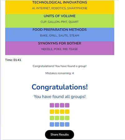 όπως σε τέσσερις ομάδες. Οι παίκτες πρέπει να κατηγοριοποιήσουν τις λέξεις σε τέσσερις ομάδες που περιέχουν τέσσερα
