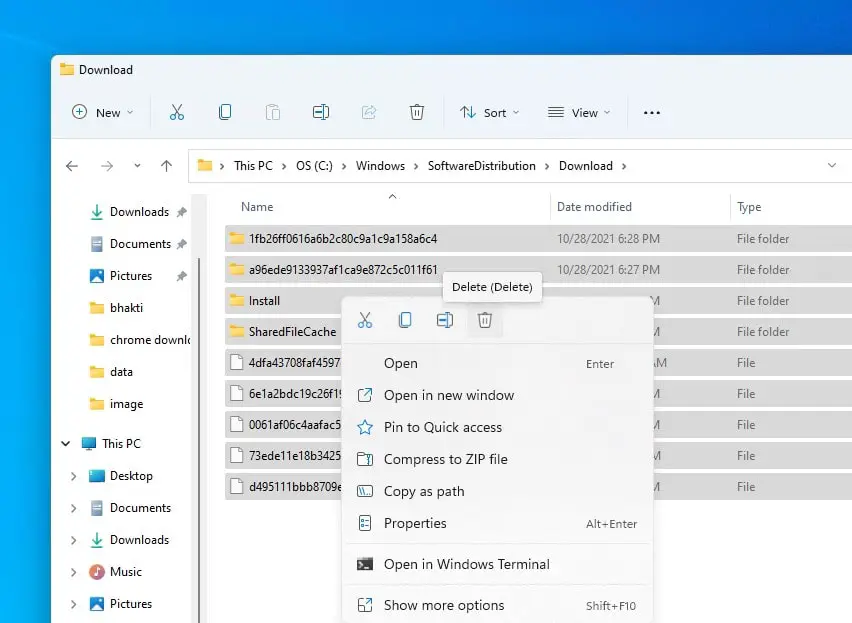 - Εδώ διαγράψτε όλα τα αρχεία και τους φακέλους μέσα στο φάκελο λήψης, πατήστε Ctrl + A για να επιλέξετε όλα τότε πατήστε Del Key