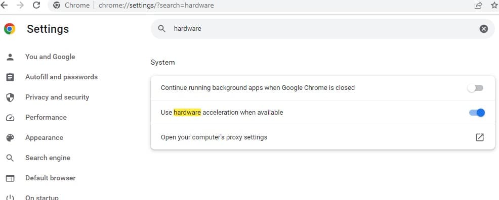 Η ενεργοποίηση της επιλογής Επιτάχυνση υλικού βελτιώνει την ταχύτητα και την απόδοση του προγράμματος περιήγησης Chrome. Αλλά μερικές φορές προκαλούν άλλα προβλήματα, όπως δυσλειτουργίες γραφικών που εμποδίζουν τη φόρτωση εικόνων στο πρόγραμμα περιήγησης Chrome.