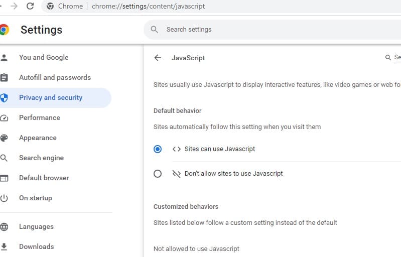 Η JavaScript είναι μια θεμελιώδης τεχνολογία Ιστού που χρησιμοποιείται από πολλούς ιστότοπους για τη βελτίωση της λειτουργικότητας και την εμφάνιση εικόνων. Μπορεί να είναι απενεργοποιημένη η JavaScript στις ρυθμίσεις του προγράμματος περιήγησης που εμποδίζουν τη φόρτωση εικόνων στο πρόγραμμα περιήγησης Chrome. Ας ελέγξουμε και ας επιτρέψουμε στους ιστότοπους να χρησιμοποιούν JavaScript στον Chrome: