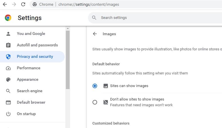 Επιπλέον, ανατρέξτε στην ενότητα Προσαρμοσμένες συμπεριφορές για να βεβαιωθείτε ότι δεν έχετε προσθέσει ιστότοπο στο Δεν επιτρέπεται η εμφάνιση εικόνων.