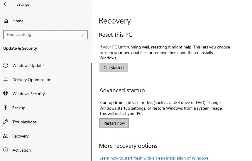 - Αναζητήστε μια επιλογή όπωςΠροηγμένη εκκίνησηήΛειτουργία ανάκτησης.