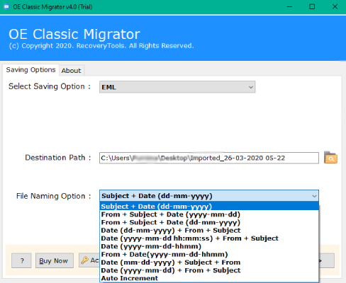 Διαδρομή εξοικονόμησης φιλικής προς το χρήστη:Με αυτό το εργαλείο, μπορείτε να αποθηκεύσετε το αντίγραφο ασφαλείας των κλασικών μηνυμάτων ηλεκτρονικού ταχυδρομείου OE, του βιβλίου διευθύνσεων, των συνημμένων σε έναν επιθυμητό προορισμό.