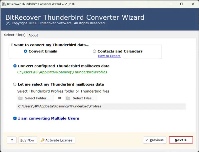 Ans:Ναι, επιλέξτε την επιλογή "Με μετατρέπω πολλούς χρήστες" κατά την προσθήκη δεδομένων προφίλ ThunderBird στον πίνακα λογισμικού. Το εργαλείο είναι σε θέση να μεταφέρει τα μηνύματα ηλεκτρονικού ταχυδρομείου Thunderbird στο Office 365 από διάφορους διαμορφωμένους λογαριασμούς.