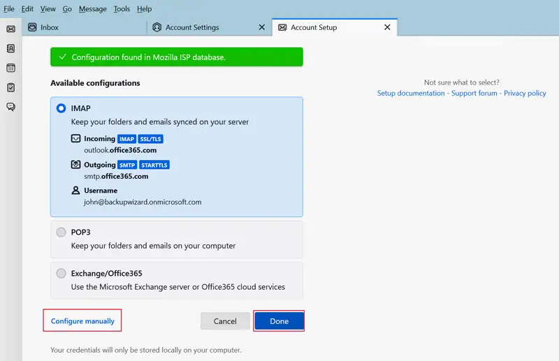 - Μετά από αυτό, εάν η ειδοποίηση τουΔιαμόρφωση που βρέθηκε στη βάση δεδομένων Mozilla ISPΈρχεται, στη συνέχεια, κάντε κλικ στο Done διαφορετικά, επιλέξτε τοΧειροκίνητη επιλογή διαμόρφωσης.